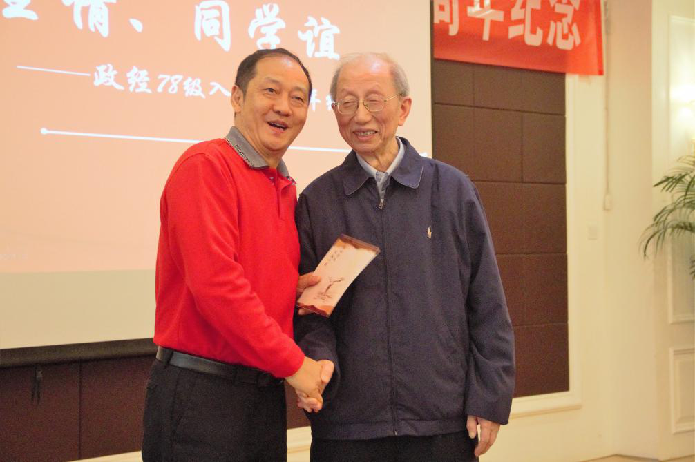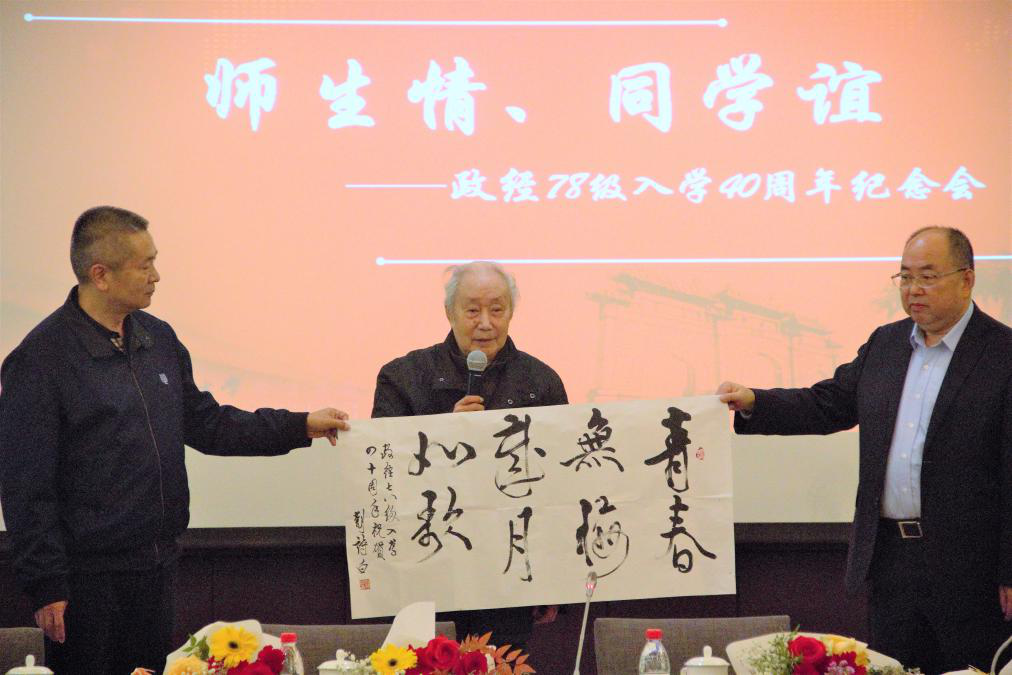 刘诗白教授向政经78级同学赠送书法《青春无悔岁月如歌》并发表讲话。他说,青春无悔:你们的青春有特殊经历,下过乡,当过农民,当过工人,经受过困难,但也经受很好的锻炼;岁月如歌:你们赶上了改革开放的好时候,成为学校的第一个班级,之后在工作上付出努力,做出贡献,为祖国蓬勃繁荣做出贡献。