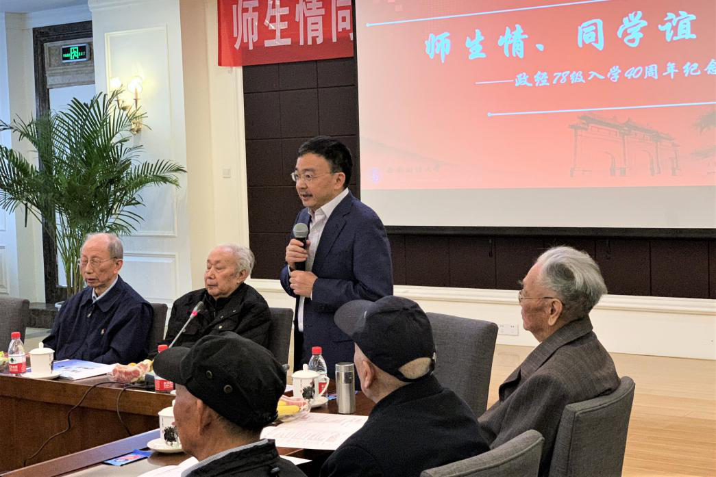 学院老领导王永锡向到会校友颁发珍藏本《入学登记表》。政经78级任课教师代表们发表讲话。他们送给在座各位两句话:今天我以财大为荣,明天财大以我为荣。经世济民,孜孜以求。昔日的校领导和老师们与在场各位追忆78级校友读大学时的点滴故事,现场氛围温馨。