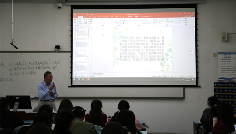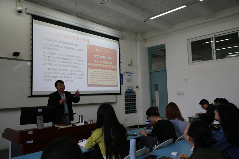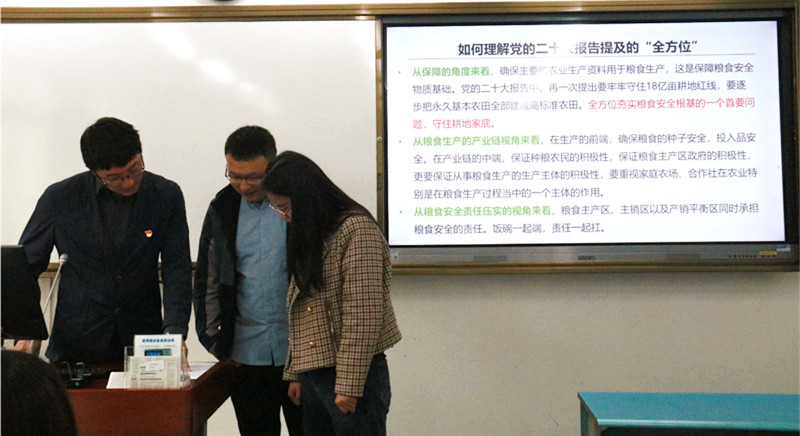 在第二阶段的教学观摩活动中,学院组织新进教师来到示范课堂,现场感受进课堂进头脑的浓厚氛围,积极交流、分享经验。《生态文明与经济发展方式研究》课程主讲教师苗壮在讲授“中国的耕地资源与粮食安全”内容时,强调党的二十大报告明确提出“全方位夯实粮食安全根基,牢牢守住十八亿亩耕地红线,确保中国人的饭碗牢牢端在自己手中”,从三个视角对“全方位”这一概念进行解读和阐释,并从理论角度分析了今年中央一号文件提及的“大食物观”。《中级宏观经济学》主讲教师刘书祥带领同学们专题学习党的二十大报告对未来中国经济的基本描述、关于高质量发展的9个重要表述等内容,结合课程实际切实提升学生的理论认识。《习近平经济思想专题研究》主讲教师蒋南平采用专题式教学,着重分析和解读党的二十大报告中关于“中国式现代化”的阐述,从历史和理论维度讲解“中国式现代化”的中国特色和本质要求。