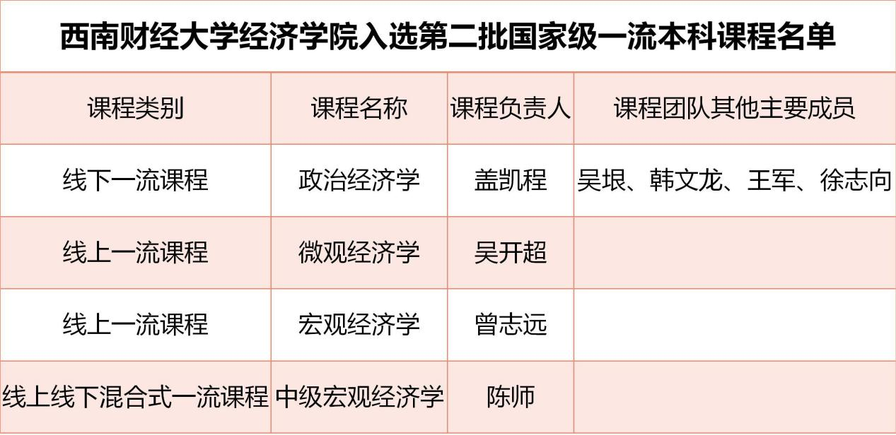 近日,教育部官网发布《关于第二批国家级一流本科课程认定结果的公示》,我院盖凯程教授团队负责的《政治经济学》、吴开超教授负责的《微观经济学》、曾志远教授负责的《宏观经济学》、陈师教授负责的《中级宏观经济学》四门课程成功入选。