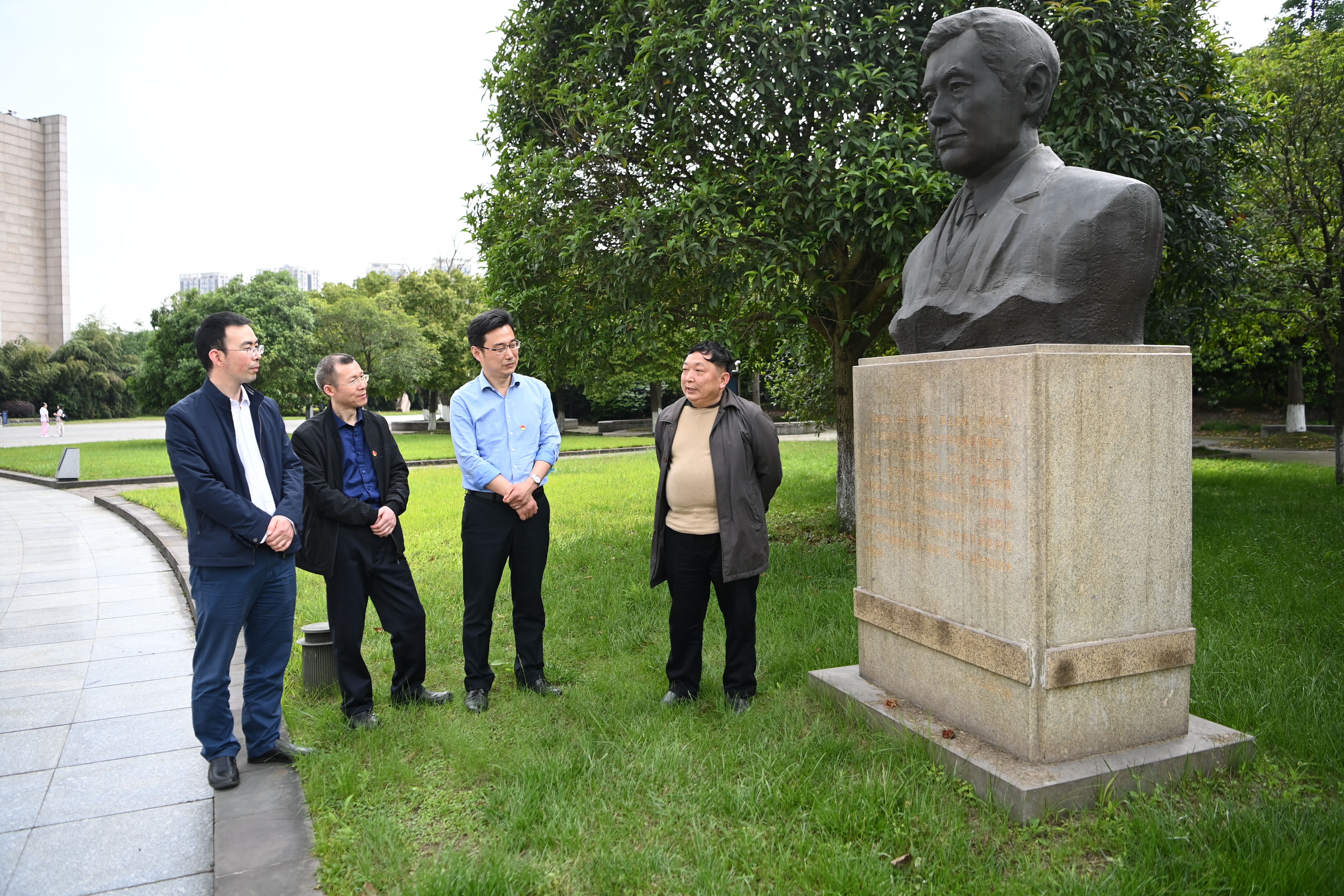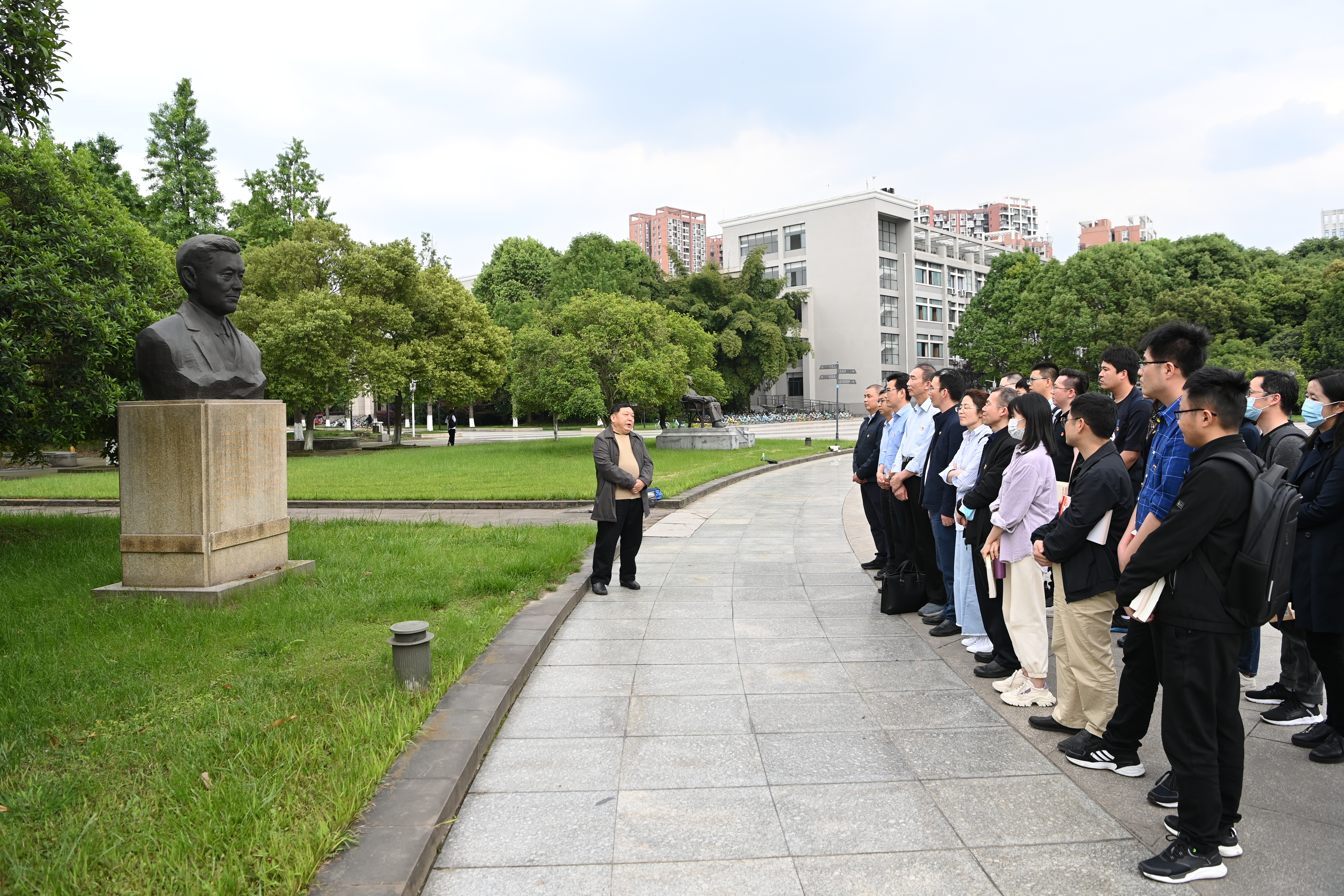 “陈豹隐先生所译《资本论》第一卷第一分册,是整个《资本论》大厦的基石,也是全书最难啃的硬骨头。”在柳林校区济民广场陈豹隐先生的铜像前,《陈豹隐全集》参编者、ylzzcom永利总站线路检测原院长刘方健教授娓娓道来,结合党史、校史和学科发展史,深情讲述陈豹隐首译《资本论》中文本,以及在北京大学与李大钊一道传播马克思主义,并为中国政治经济学、财政学、人口学等学科奠定理论基础,做出卓越贡献的故事。刘方健还带领大家一同回顾了以陈豹隐、彭迪先、汤象龙、刘诗白等为代表的西财几代经济学大师奋力推动马克思主义经济学中国化的百年历程。在ylzzcom永利总站线路检测分党委书记兰敏、副院长盖凯程、支部书记韩文龙的带领下,ylzzcom永利总站线路检测分党委教师第一支部老中青三代老师全程静立聆听,被以陈豹隐为代表的老一辈经济学人为国家谋富强、为民族谋复兴的家国情怀和经世济民、孜孜以求的执著追求深深感染。