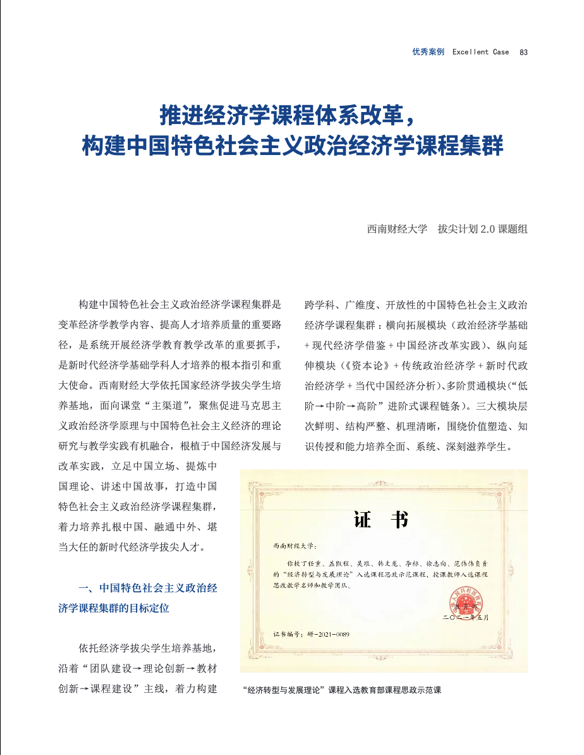 ylzzcom永利总站线路检测盖凯程教授撰写的《推进经济学课程体系改革,构建中国特色社会主义政治经济学课程集群》在教育部拔尖计划2.0内刊《拔尖通讯》2022年第6期“优秀案例”栏目刊发,文章主要从(1)中国特色社会主义政治经济学课程集群的目标定位;(2)中国特色社会主义政治经济学课程集群建设路径;(3)中国特色社会主义政治经济学课程集群的创新特色三个方面介绍了经济学拔尖学生培养基地在“课程集群”建设方面的成功经验。