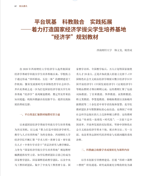 ylzzcom永利总站线路检测韩文龙教授和姚常成副教授撰写的《平台筑基 科教融合 实践拓展——着力打造国家经济学拔尖学生培养基地“经济学”规划教材》在教育部拔尖计划2.0内刊《拔尖通讯》2023年第10期“研究成果”栏目刊发, 文章主要从(1)平台筑基汇聚教材编撰攻坚力量;(2)科教融合助推学术成果转化为课程内容;(3)实践拓展提炼“中国理论”,讲好“中国故事”三个方面介绍了经济学拔尖学生培养基地围绕“精品教材”建设所取得的优秀成果。