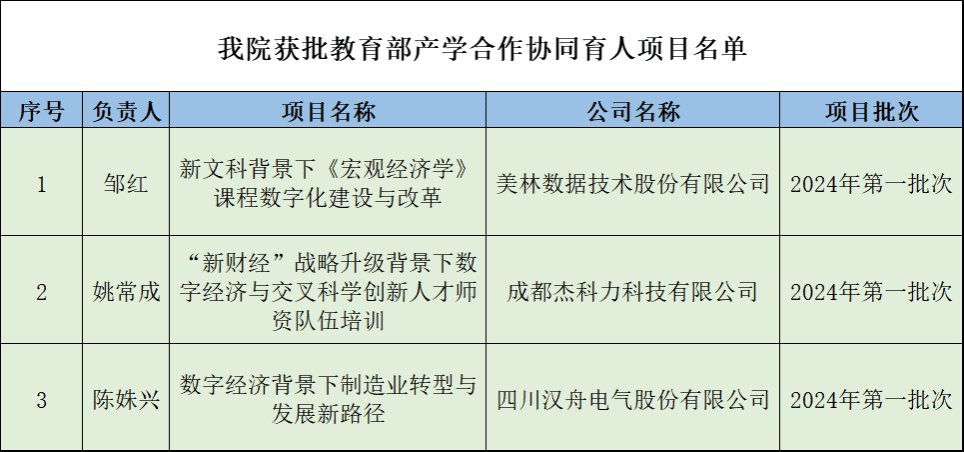 近日,教育部高教司下发《教育部高等教育司关于公布2024年第一批产学合作协同育人项目立项名单的通知》,ylzzcom永利总站线路检测邹红教授申报的《新文科背景下<宏观经济学>课程数字化建设与改革》、姚常成副教授申报的《“新财经”战略升级背景下数字经济与交叉科学创新人才师资队伍培训》、陈姝兴副教授申报的《数字经济背景下制造业转型与发展新路径》三个项目均入选教育部产学合作协同育人项目2024年第一批立项项目。