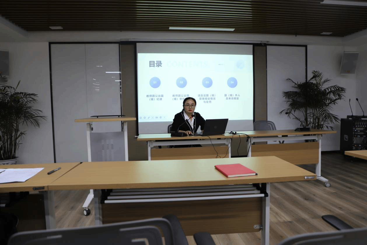 随后,邹红副院长带领全院教师共同学习了教师因公出国(境)纪律、教师因公出国(境)审批流程、违反出国(境)管理规定情况与处罚、国(境)外人员来访规定等外事相关事项。