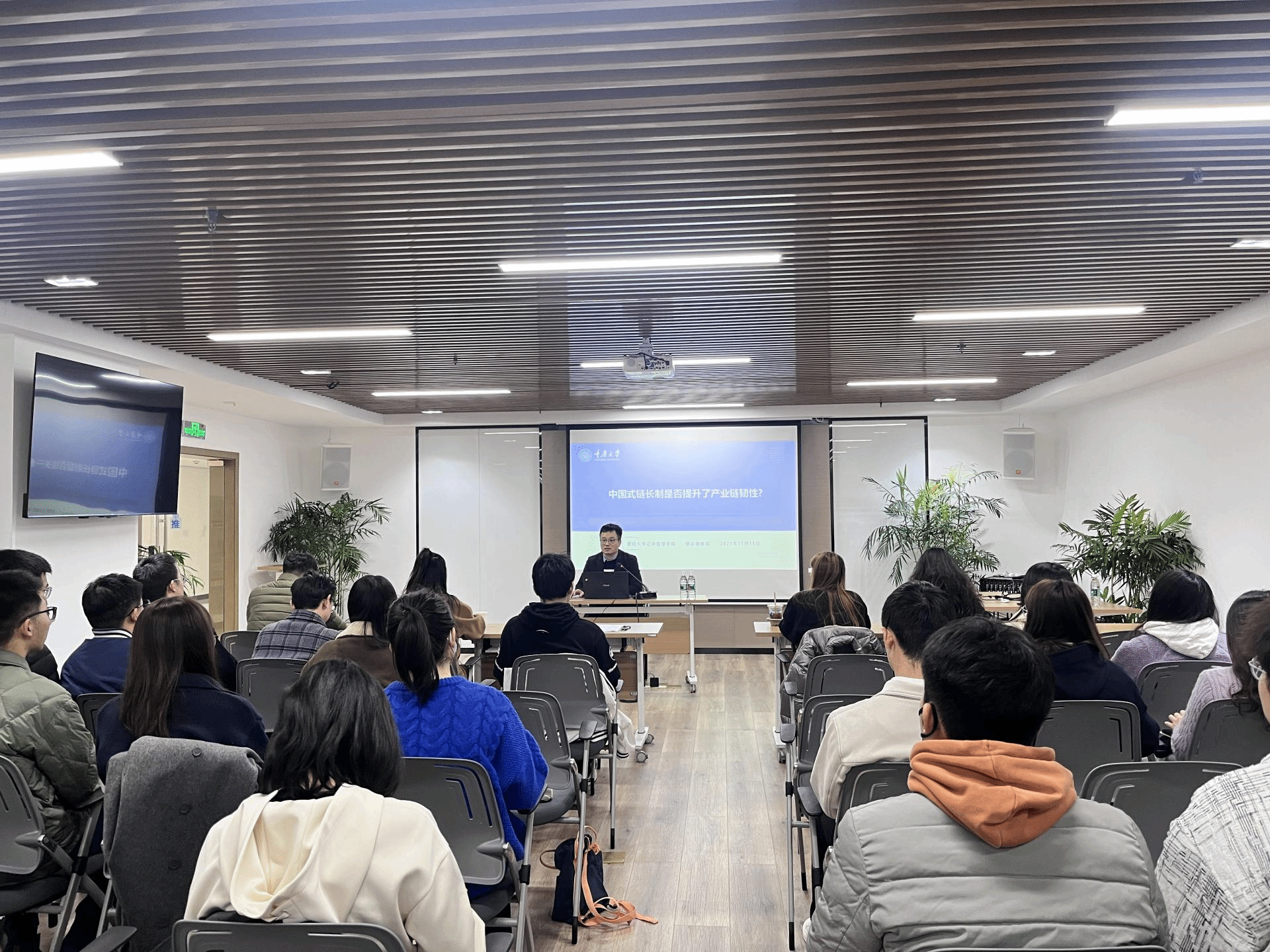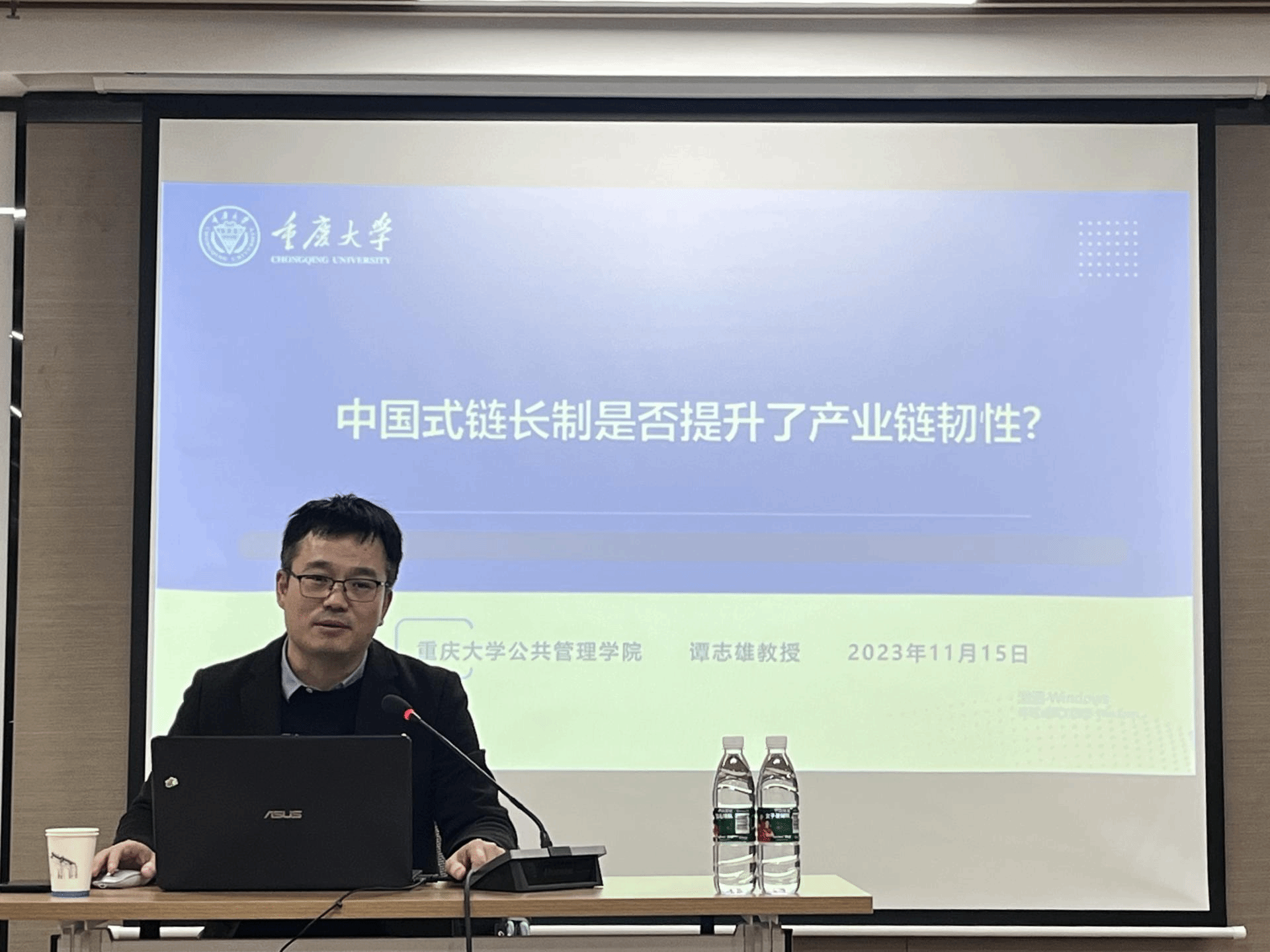 重庆大学公共管理学院谭志雄教授在本次讲座中以“中国式链长制是否提升了产业链韧性”为题,围绕链长制的提出背景、实证检验、推行困境与优化路径做了精彩报告。讲座由ylzzcom永利总站线路检测陈姝兴老师主持,三十余名师生积极参与。